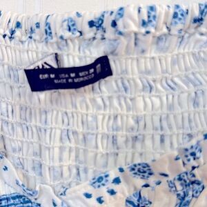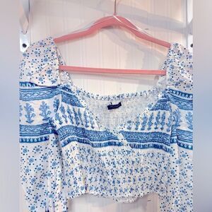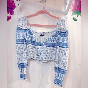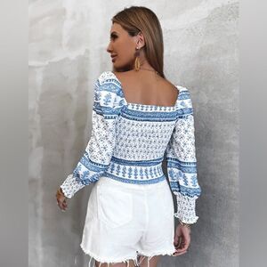 Chic and stylish, this blue and white smocked top is perfect for any occasion. The intricate pattern adds a touch of elegance to your wardrobe.