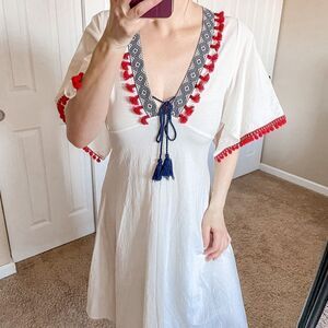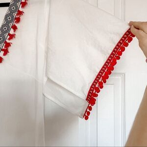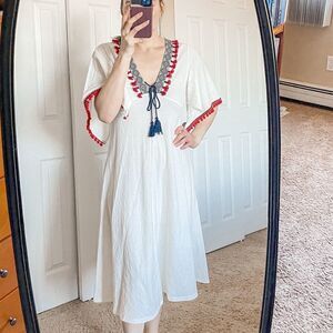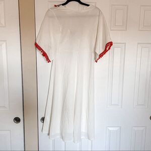 Features: short butterfly sleeves, red Pom Pom and tassel trim, V neck, midi length, white
