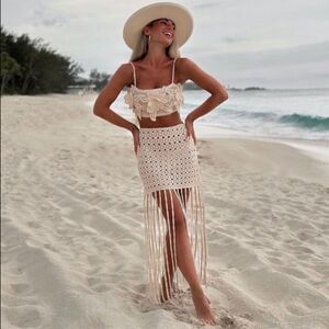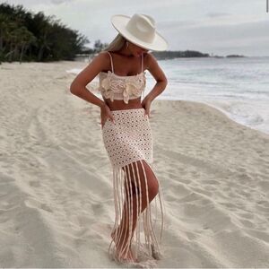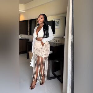 High waist midi skirt. Fringe trim. Hidden in-seam side zip closure.
