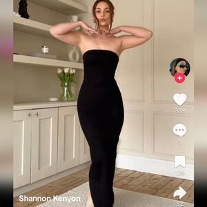 Strapless knit fabric fitted dress with straight neckline. Ruched fabric. Side hidden in-seam zip closure.