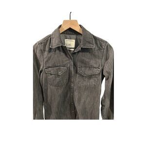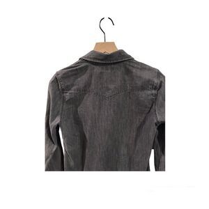 This is perfect for all year round with it's lightweight and layering option! It is a light to medium wash with a snap button down front. There are two check pockets which also have a snap closure to them. This is in very good to like new condition.