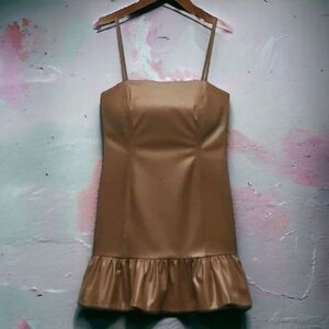 Zara Brown Faux Leather Spaghetti Strap Bodycon Mini Dress Ruffle Hem Small Clubwear Neutral Fun Flirty Date Night