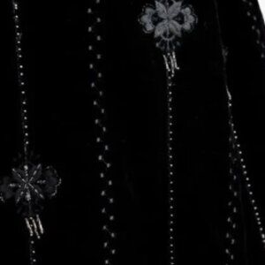 Round neck long sleeve cardigan. Embroidered detail with bead appliqué. Printed interior lining.