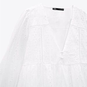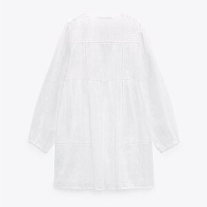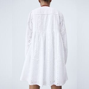 Short dress with a V-neckline and long sleeves. Featuring matching cutwork embroidery, lining, flared hem and front fastening with covered buttons.