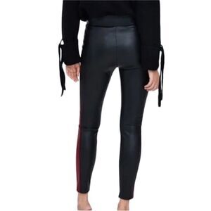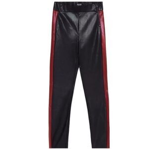 Zara Faux Leather Stripe Leggings Black with a burgundy red stripe, Zipper ankle. Side zipper Closure Approx measurements Waist 15", Length 38.5", Rise 10.5", Inseam