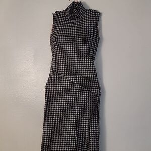 Sleeveless midi dress with a high neck. Seamless finish detail. Invisible zip fastening at the back and raw hem