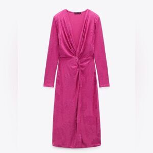 V-neck dress with long sleeves with shoulder pads. Front slit at hem.