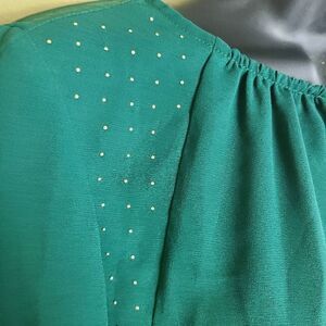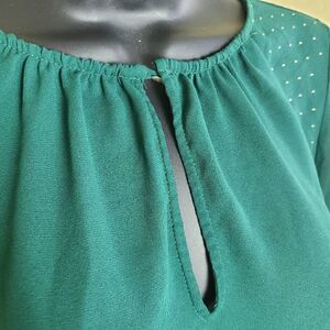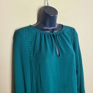 This is a long sleeved Emerald green blouse by Zara. It has a keyhole opening on the chest and studded detailing at the shoulders. There is elastic at the neckline and cuffs, and a small button at the top of the keyhole.