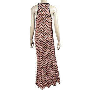 This eye-catching Zara Knit maxi dress brings vibrant color and texture to your wardrobe. Crafted in a sleeveless silhouette, it features a bold chevron stripe pattern in multicolored yarns with pops of metallic thread for a striking effect. The open-knit crochet-style design adds a breezy, bohemian touch while maintaining an elegant straight-line shape.