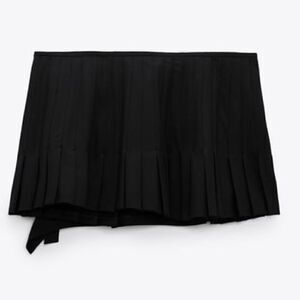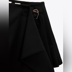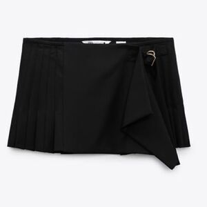 Mid-rise mini skirt made of viscose blend fabric. Overlapping wrap style fabric with adjustable buckle. Box pleats at hem.