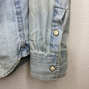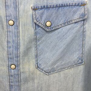 Zara Man Western Button Down Light Blue Denim Collar Shirt. Features fading to give a worn in effect, cream colored snaps, two front chest pockets with snaps, and along cuffs. In great condition. Men’s size M