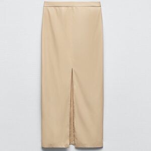 High-waisted midi skirt with side pockets. Back vent. Front zip, metal hook, and interior button closure.