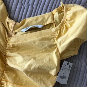 NWT never been worn Zara ruched dress in yellow. Size S, fits TTS, stretchy material. V neck, balloon sleeves. Bloggers favorite. Very beautiful and stylish. Happy Poshing!