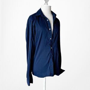 Men's shirt. Navy blue button down shirt. Polka dot print. Wear it fitted or oversized. New without tags