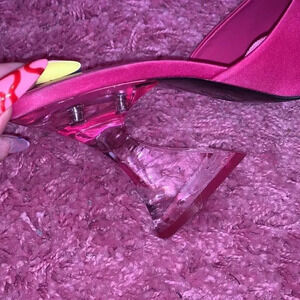 Lightly Worn. Zara Pink Satin Heeled Methacrylate Mule Sandals. Light markings at toe box.