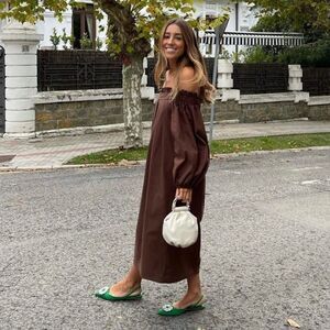 Strapless straight neck dress. Long sleeves with elastic cuffs. Pleats and smocked elastic detail.