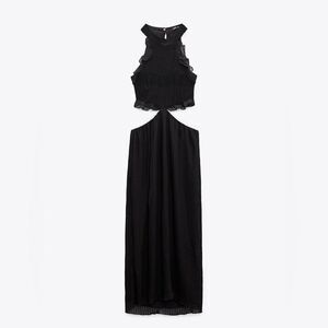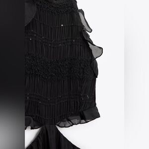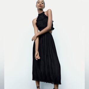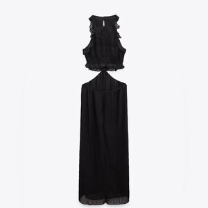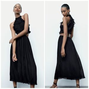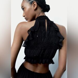 Midi halter dress with ruffles and sequin appliqués. Side vents at elastic waistband. Interior lining. Back hidden in-seam zip and button closure.