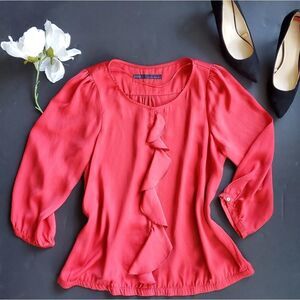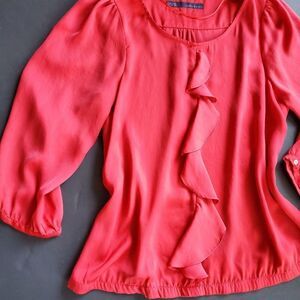 Red color Open neck style 3/4 sleeves Ruffle details on front No stains No tears Size medium 100% polyester Dry clean only Smoke free home