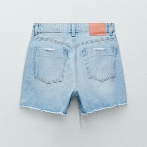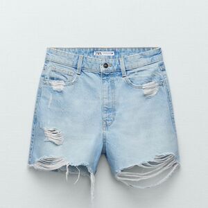 High-waisted five pocket shorts. Washed effect. Ripped detail and unfinished hem. Front zipper and metal button closure.