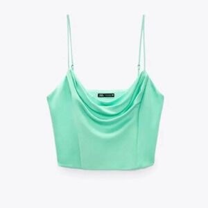 Top with draped neckline and adjustable spaghetti straps. Side hidden in-seam zip closure.