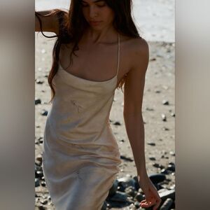 Midi dress with fluid neckline with tied collar. Strap detail at back. Hidden in-seam zip closure.