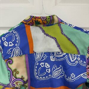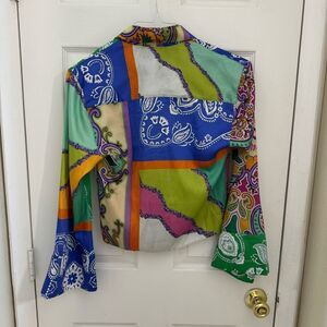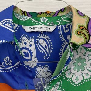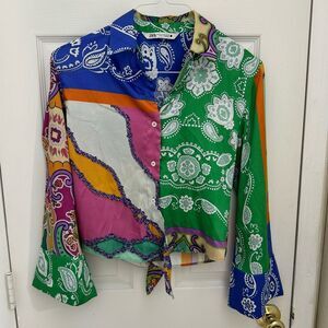 Zara Satin Women’s Tie Front Patterned Blouse Size XS Chain Wide Sleeves