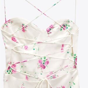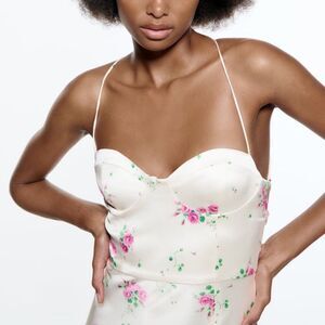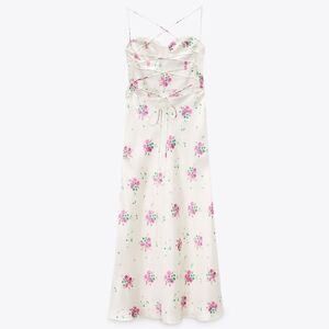 Sweetheart neckline midi dress with adjustable cross-back spaghetti straps. Front slit at hem.