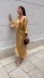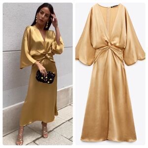 Midi dress with knotted V-neckline and wide long sleeves. Back zip closure.