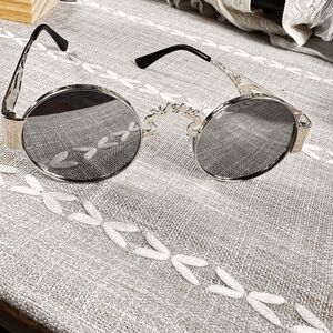 Stylish silver sunglasses with intricate detailing and black accents. Perfect for adding a touch of elegance to any outfit.
