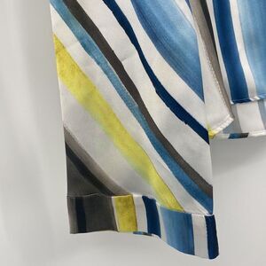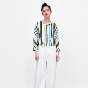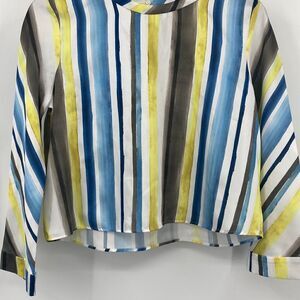 Zara Striped Long Sleeve Cropped Blouse Medium. Back neck button and keyhole closure, wide sleeves. Yellows, blue white and gray stripes. Gently used condition with no visible flaws.
