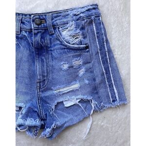 Zara Trafaluc Denimwear Distressed Ripped Shorts with sporty side two tone stripes. Shaded back pocket cutout.