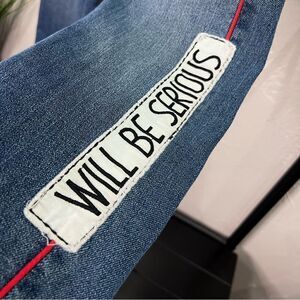 Medium wash, mid rise, "Will Be Serious" and "No Idea" factory patches, red stripe down sides