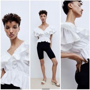 Zara White Ruffle Flounce Sleeve V-Neck Peplum Top