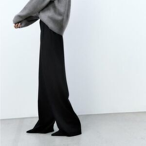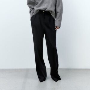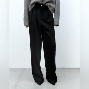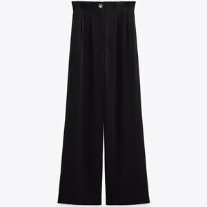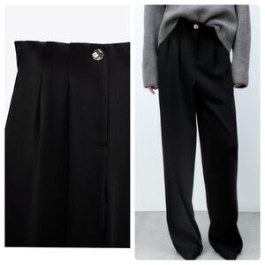 High rise pants with back elastic waistband. Front darts and pockets. Wide leg. Front closure with zipper and gold button.