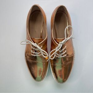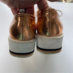 Super cool Rose Gold platform oxfords. Mirror finish. White rubber platform with accent stripe. Top shows a little sign of wear in the manmade upper- see photo - but still super shiny.