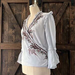 Zara Woman Blue White Striped Embroidered Wrap Top Sz-Medium
