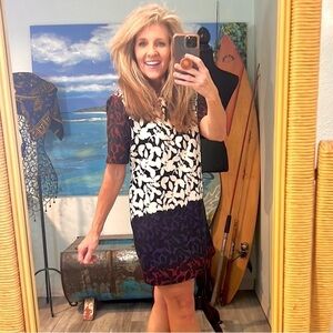 Zara Woman, Lovely cool weather piece.. printed color block, Back zipper, short sleeves, straight cut.