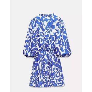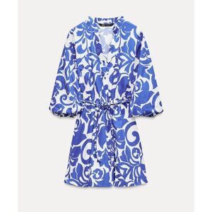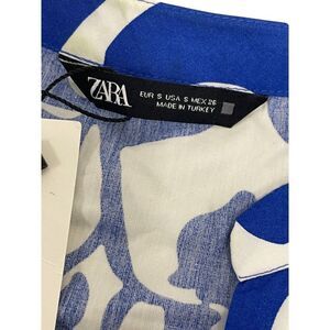 Zara Women Tile Dress S Blue White Sicilian Button Up Linen Viscose Blend NWT