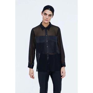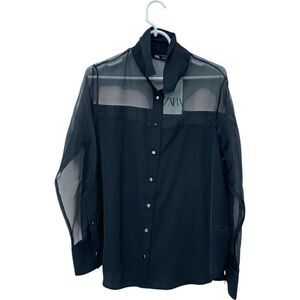 Zara Women Top Blouse Large Black Sheer Combination Shirt Kemeja 8372/259 NWT