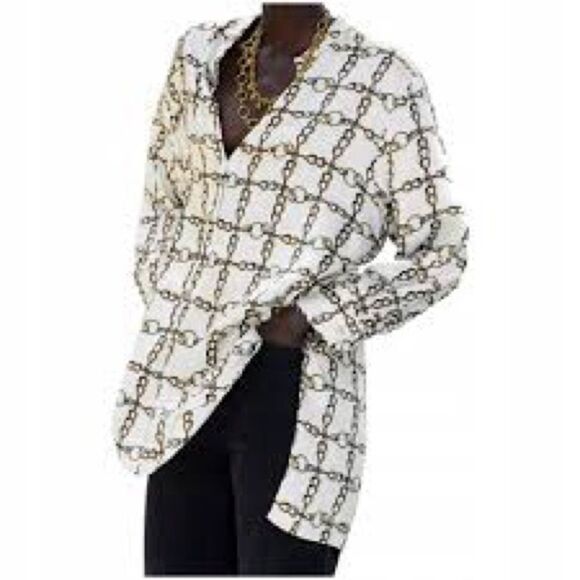 Zara Women’s Chain Print Tunic Shirt Asymmetric Hem with Side Vents Size L Approximately Measurement: Shoulder 19”/Pit 24”/Sleeve 23”/Length 32”/36” Made in Spain