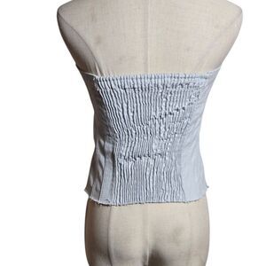 This cute Zara top is like a denim bustier but more chill. It's strapless, so perfect for showing off your shoulders, and it's got cool silver buttons down the front. Plus, check out those little pocket details – so adorable. The light wash gray with a bit of sparkle denim gives it a super fresh and casual vibe. You could totally rock this with some high-waisted jeans or a cute mini skirt. It's giving major cool-girl energy! ✨
