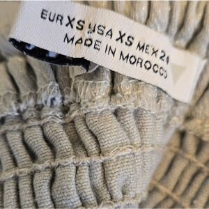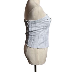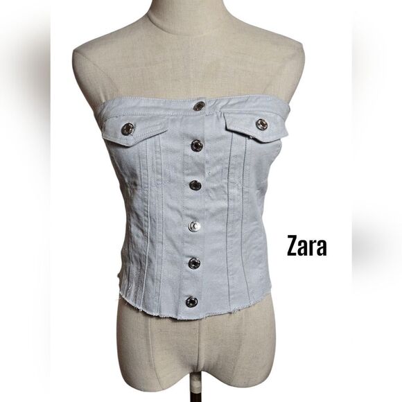 This cute Zara top is like a denim bustier but more chill. It's strapless, so perfect for showing off your shoulders, and it's got cool silver buttons down the front. Plus, check out those little pocket details – so adorable. The light wash gray with a bit of sparkle denim gives it a super fresh and casual vibe. You could totally rock this with some high-waisted jeans or a cute mini skirt. It's giving major cool-girl energy! ✨