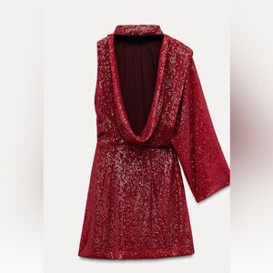 High collar dress with asymmetric long sleeves. Open back and sequin detail. Hidden zip closure at side. Interior lining.