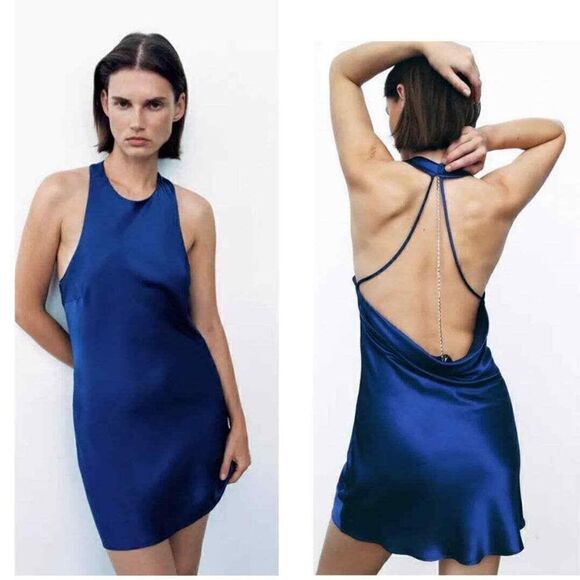 Zara bloggers favorite Blue Satin Effect Jewel Chain Mini Dress Size small