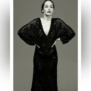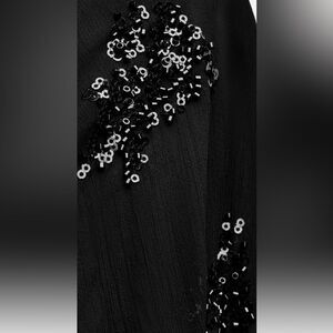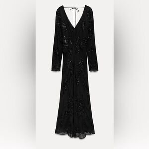 Semi-sheer dress with V-neck at front and back with back ties. Long sleeves. Embroidered detail with sequins appliqué. Interior lining.