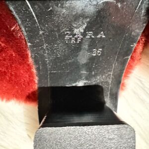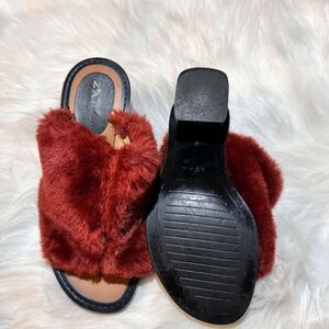 Worn one in great condition fuzzy burnt red color with chunky heel Heel size 3 inches súper comfy