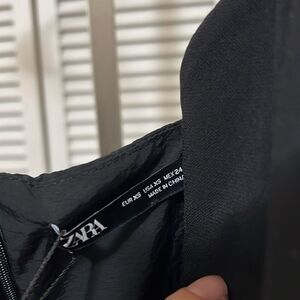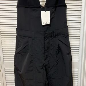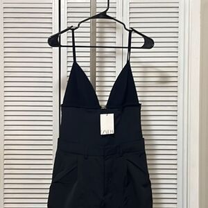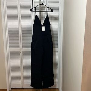Long jumpsuit with V-neck and adjustable thin straps. Side pockets and back false welt pockets. Tonal matching fabric. Back hidden in-seam zip and front metal hook closure.