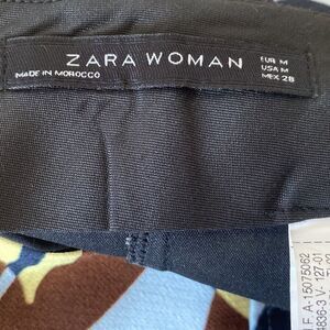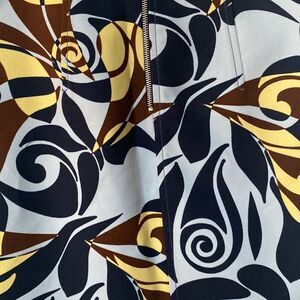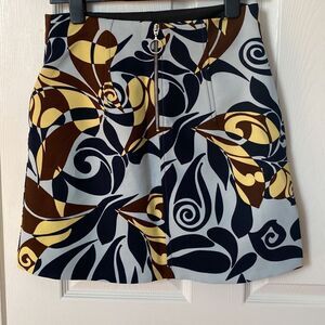 Above the knee skirt with blue, yellow, brown abstract/floral print and zipper closure in the back. Has two frontal sewn in pockets, so not usable but looks cute. Gently worn, no tears. Comes from smoke free home.