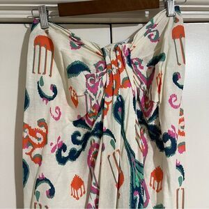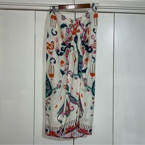 Vibrant wrap skirt with a colorful pattern. Features shades of green, orange, and pink on a white base.