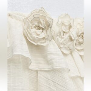 Off the shoulders straight neck top with very short sleeves. Textured flower detail in same fabric and ruffles.